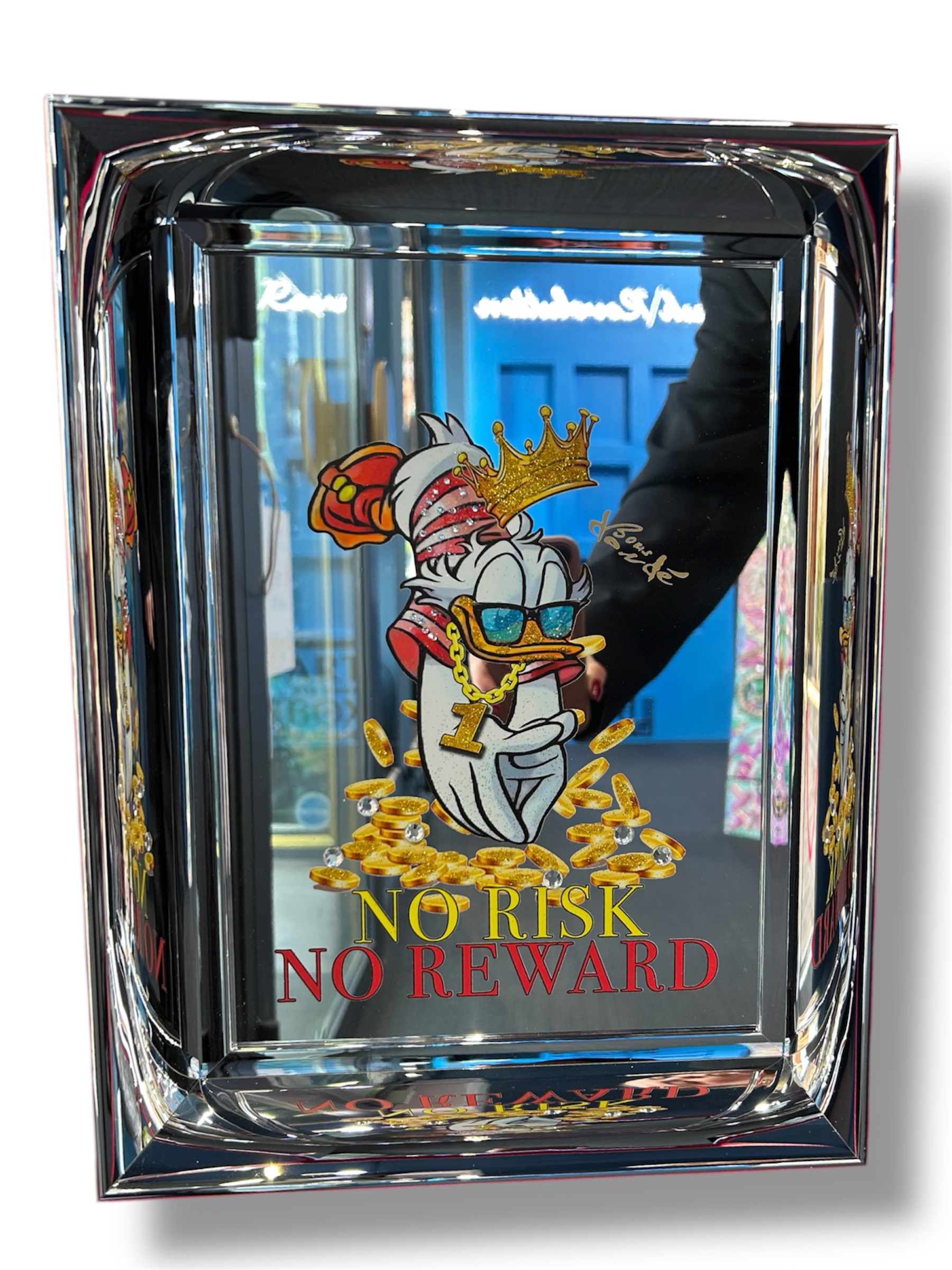 Mixed media on mirror, gold leaf, diamond dust, crystals